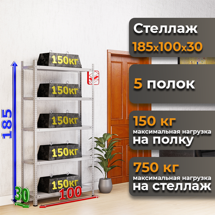 - Высокая грузоподъемность: Каждая из 5 полок выдерживает до 150 кг, а общая нагрузка на стеллаж достигает 750 кг.