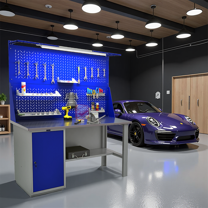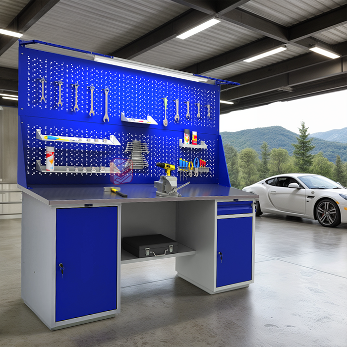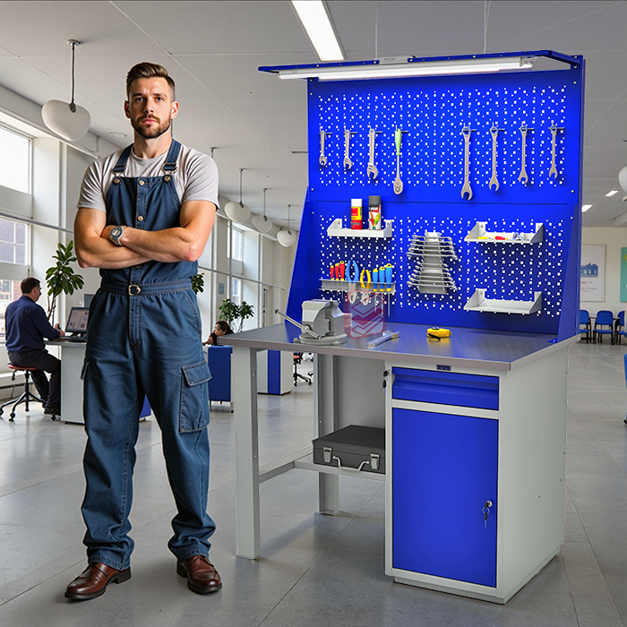 Столешница верстака изготовлена из МДФ толщиной 24 мм и покрыта оцинкованным листовым металлом толщиной 1,2 мм, что обеспечивает долговечность и стойкость к механическим повреждениям. Порошковое покрытие придаёт корпусу современный и эстетичный вид.